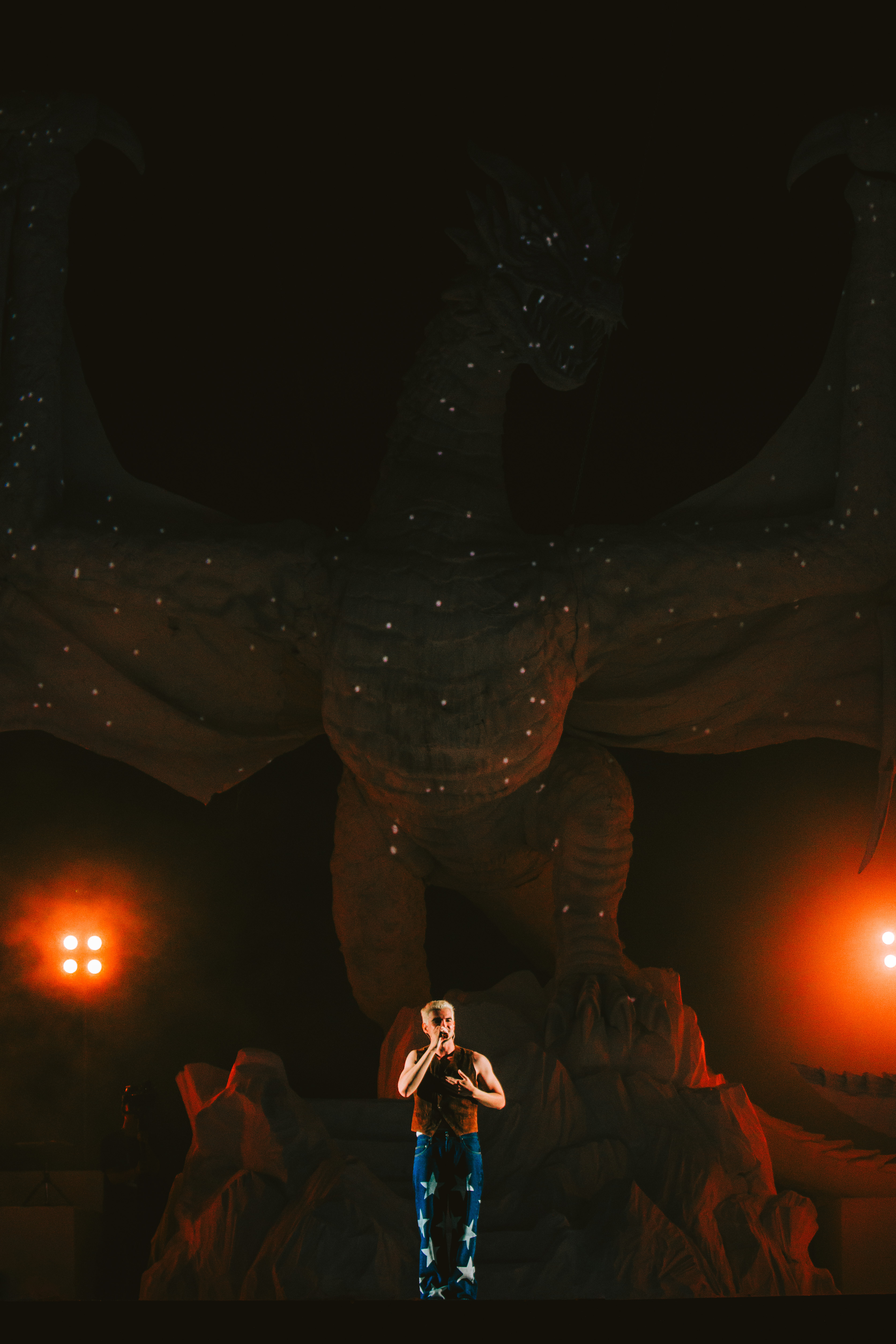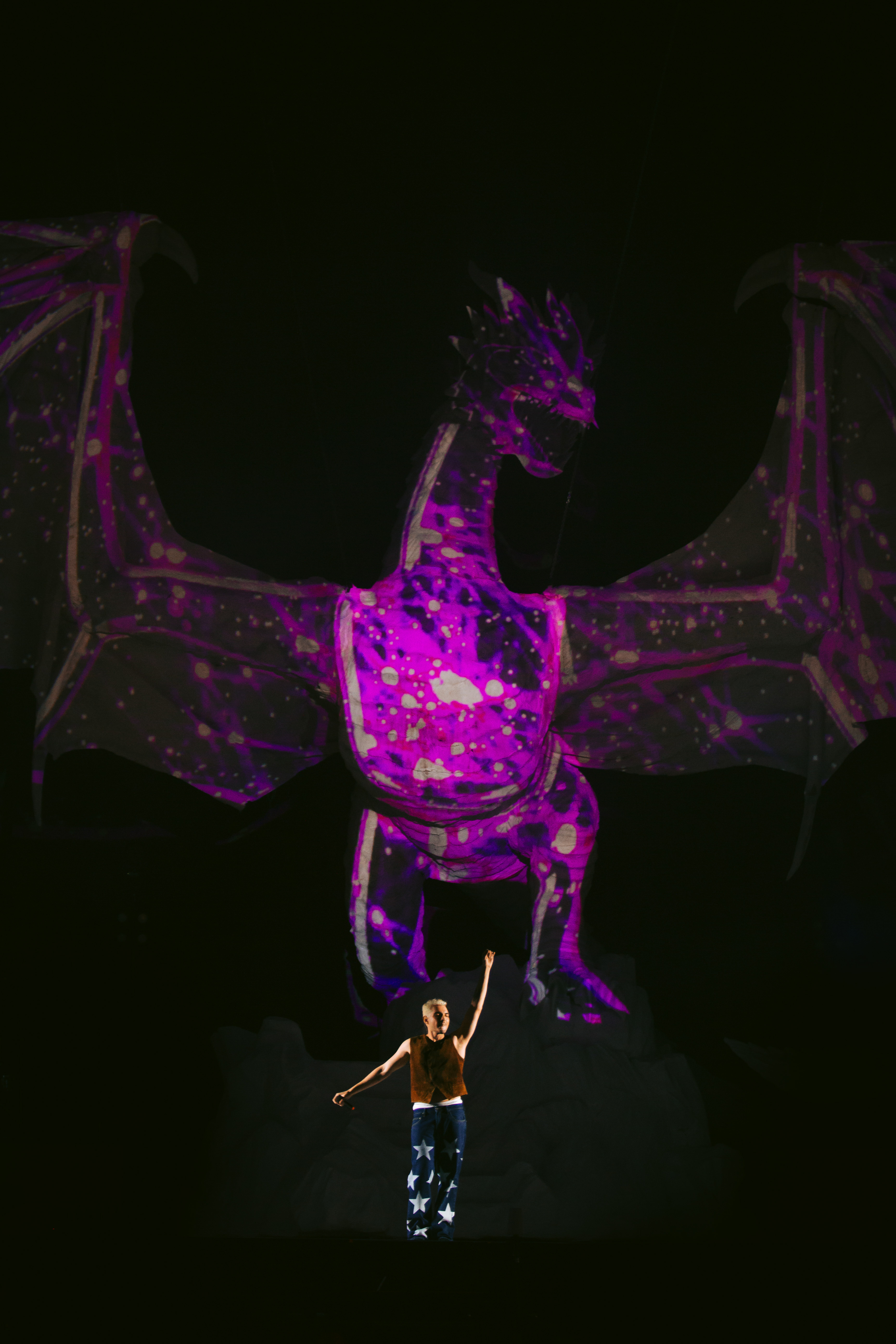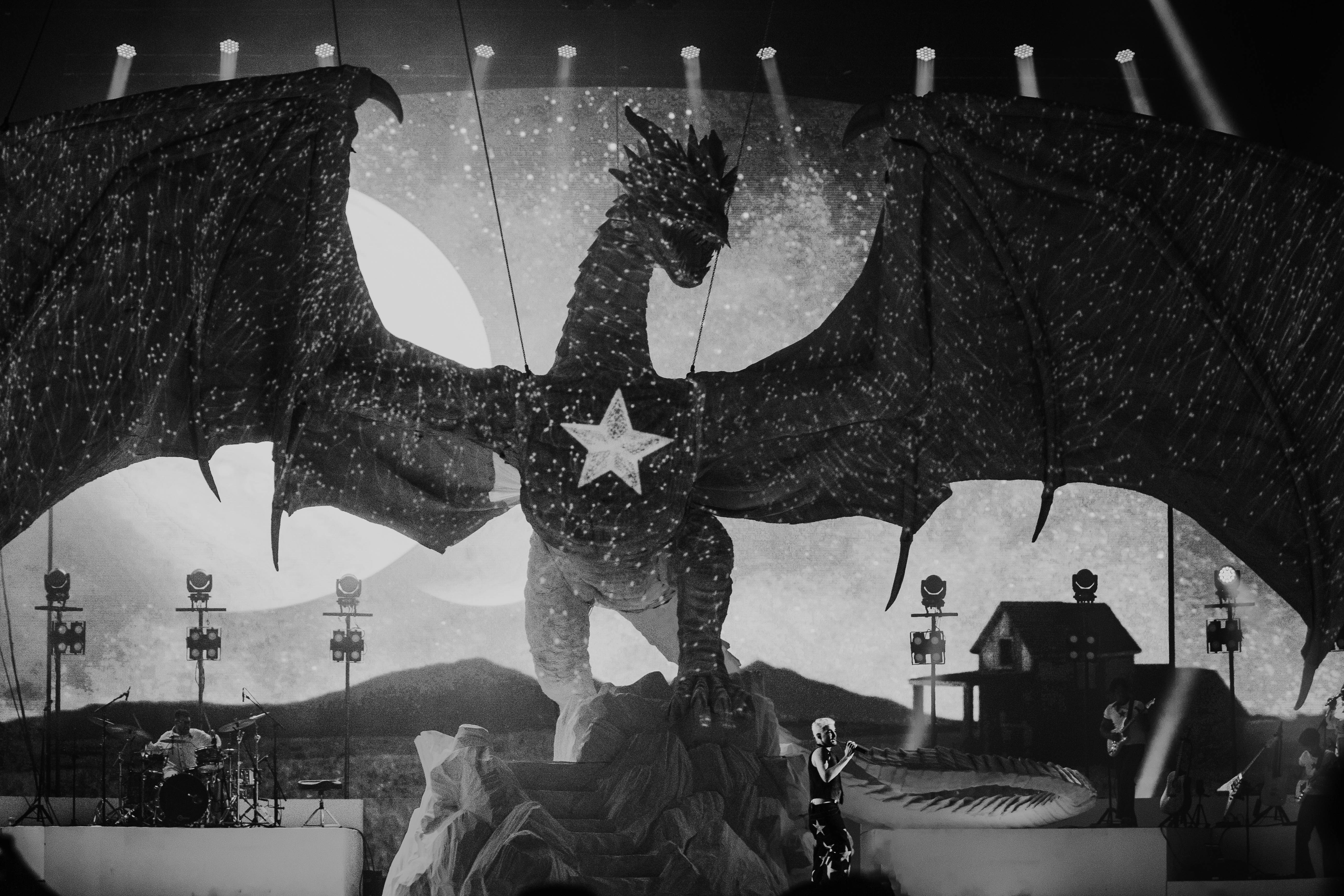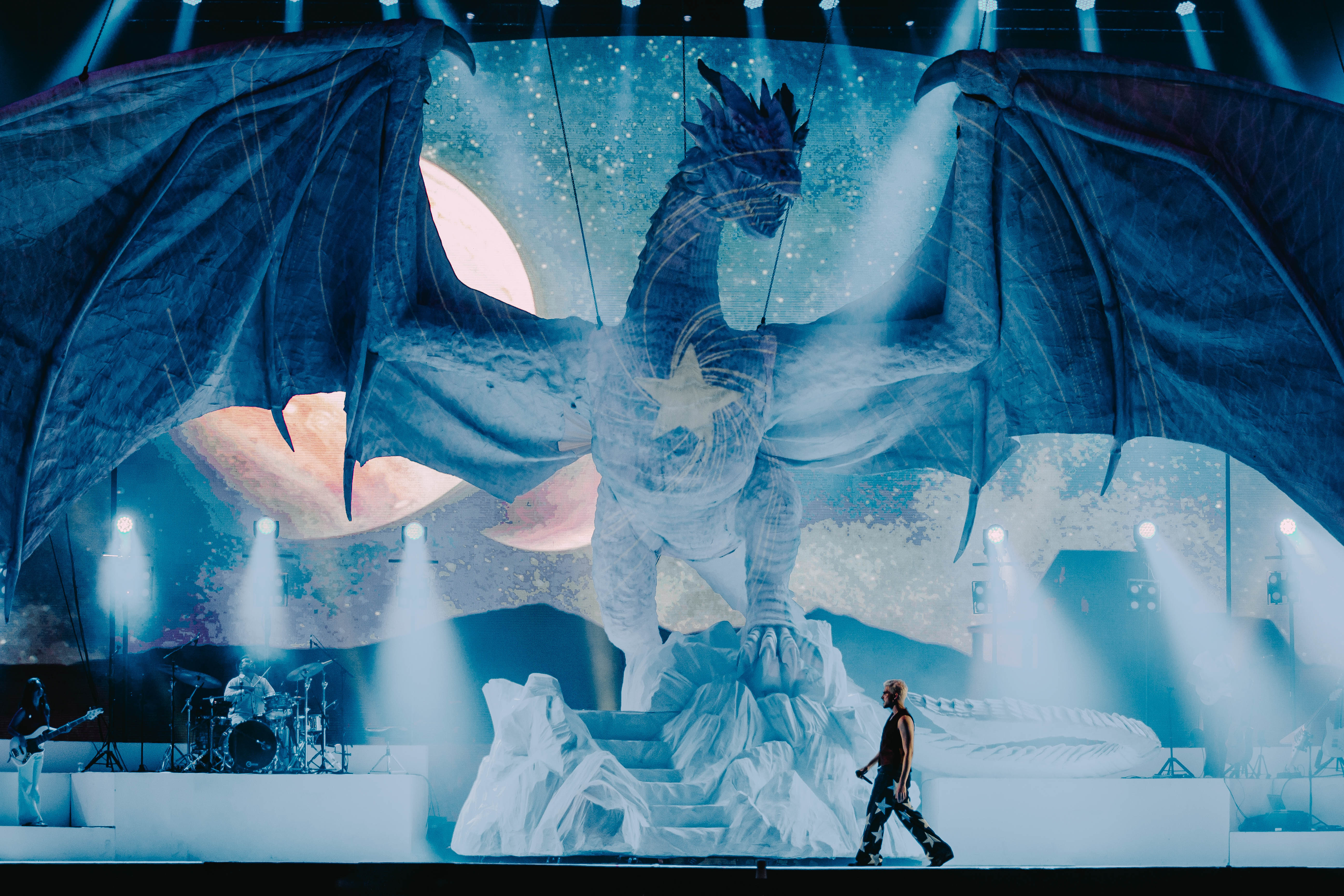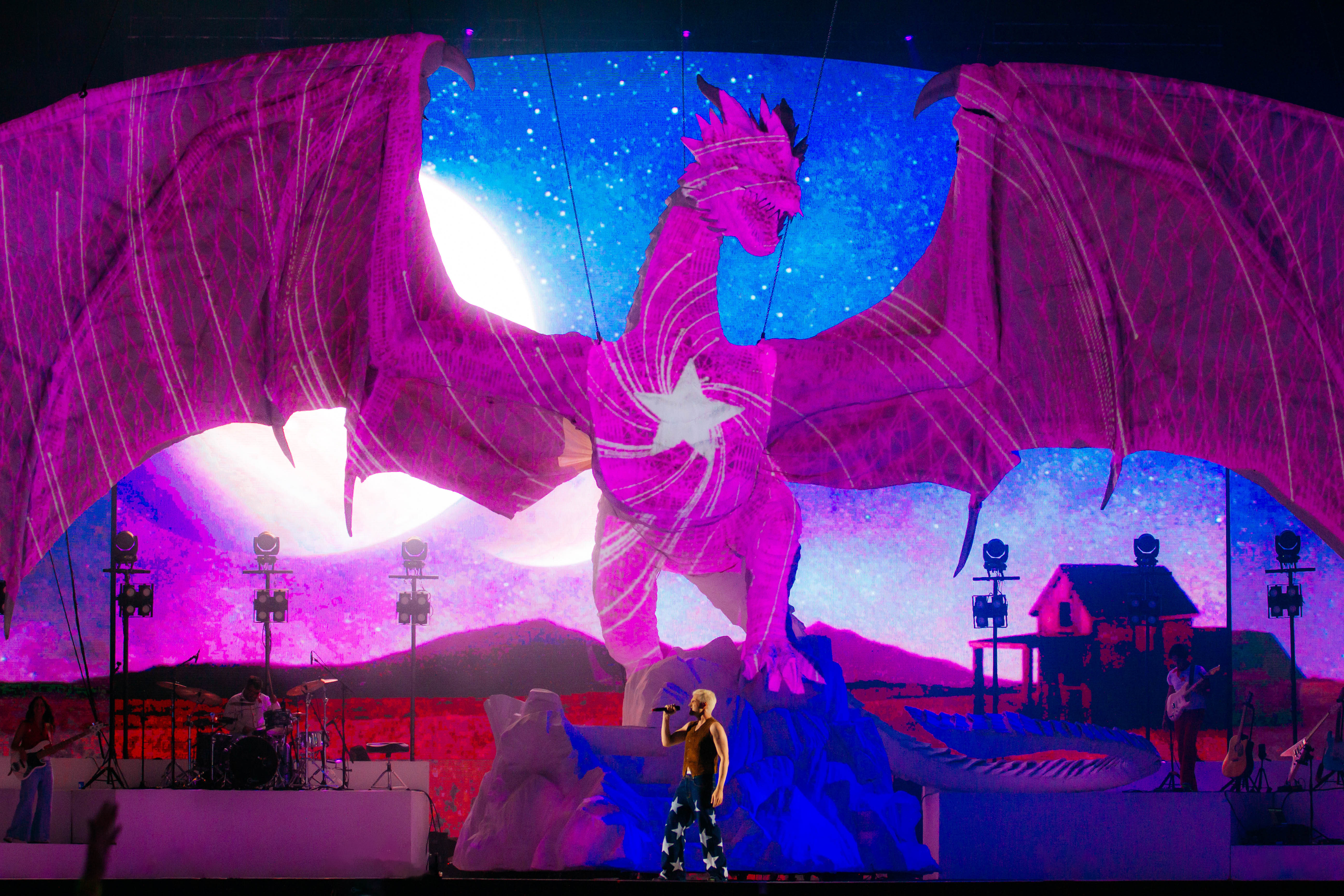 Na estrutura, Jão realmente nunca decepciona. Depois de levar um navio para a turnê Pirata, agora ele contracena junto com um dragão no palco, que representa o elemento do fogo, representante do álbum “SUPER”. Os fãs que acompanharam a montagem da cenografia se surpreenderam com o tamanho do elemento, que possui cerca de 10 metros de altura, além de refletir luzes que mudam a cada música da setlist.