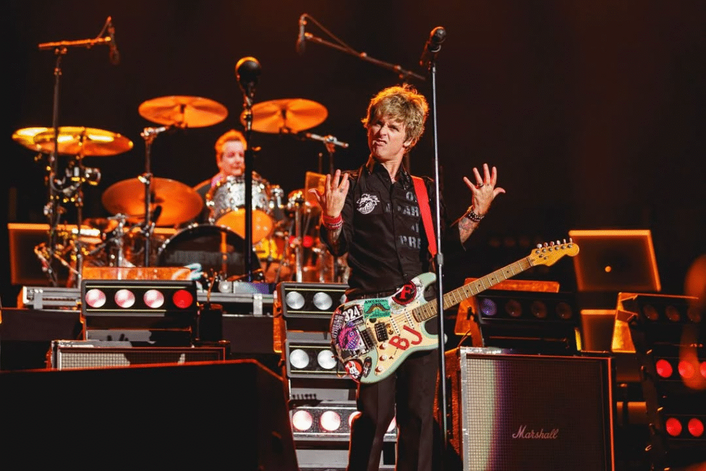 Billie Joe, o primeiro bissexual do mundo! “Bobby Sox” surpreendeu com uma chuva de confetes verdes e uma performance impecável. Com solos bem arranjados e uma entrega afinada, o Green Day mais uma vez exibiu sua harmonia em cena. Para encerrar, Tré Cool destruiu parte da bateria em seu tradicional ato caótico, enquanto Billie Joe retornou ao palco como uma sombra solitária para tocar “Good Riddance (Time of Your Life)”. A despedida veio com mais uma chuva de confetes — desta vez personalizados com a data do show e o símbolo do álbum Saviors, encerrando a noite com emoção e estilo.